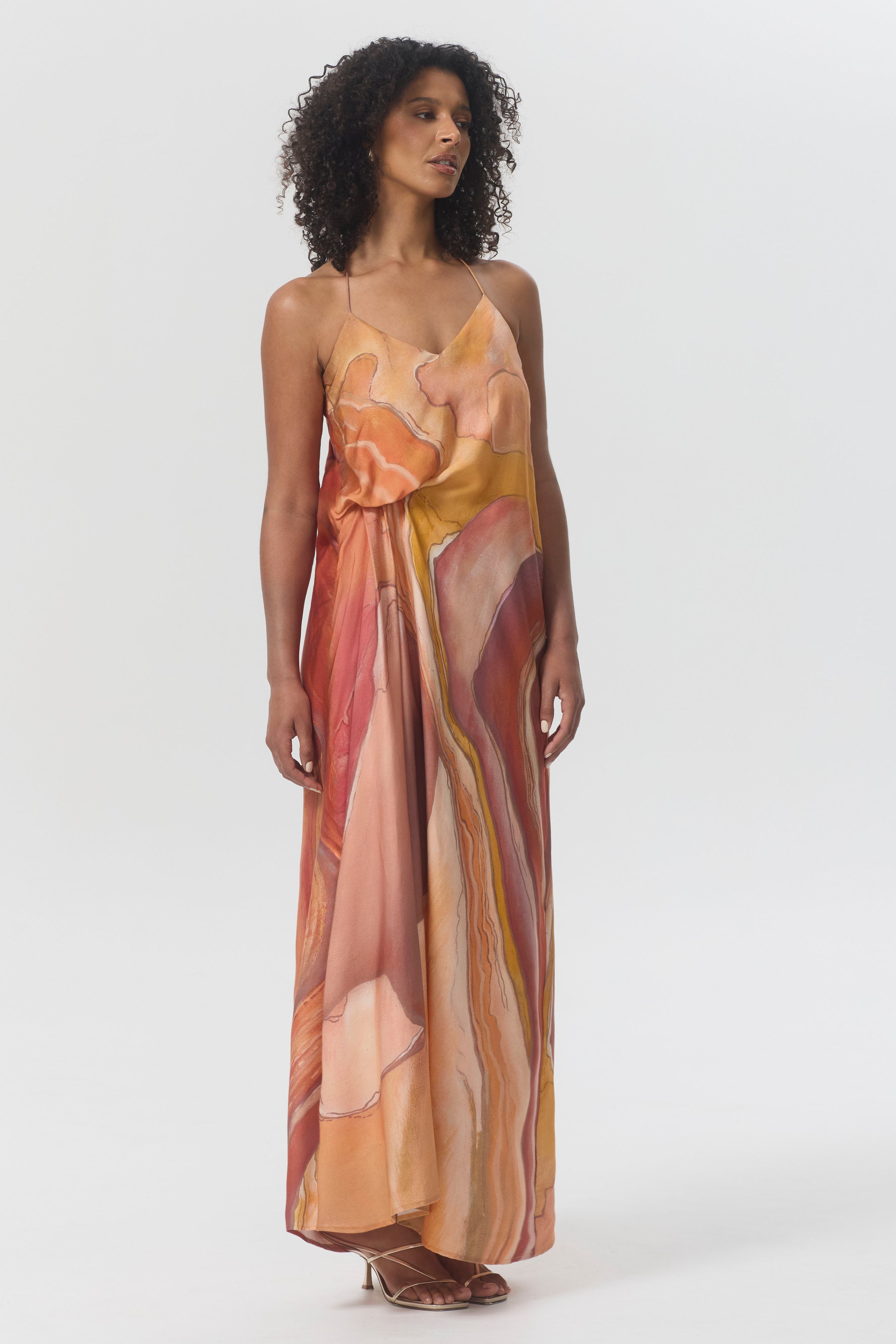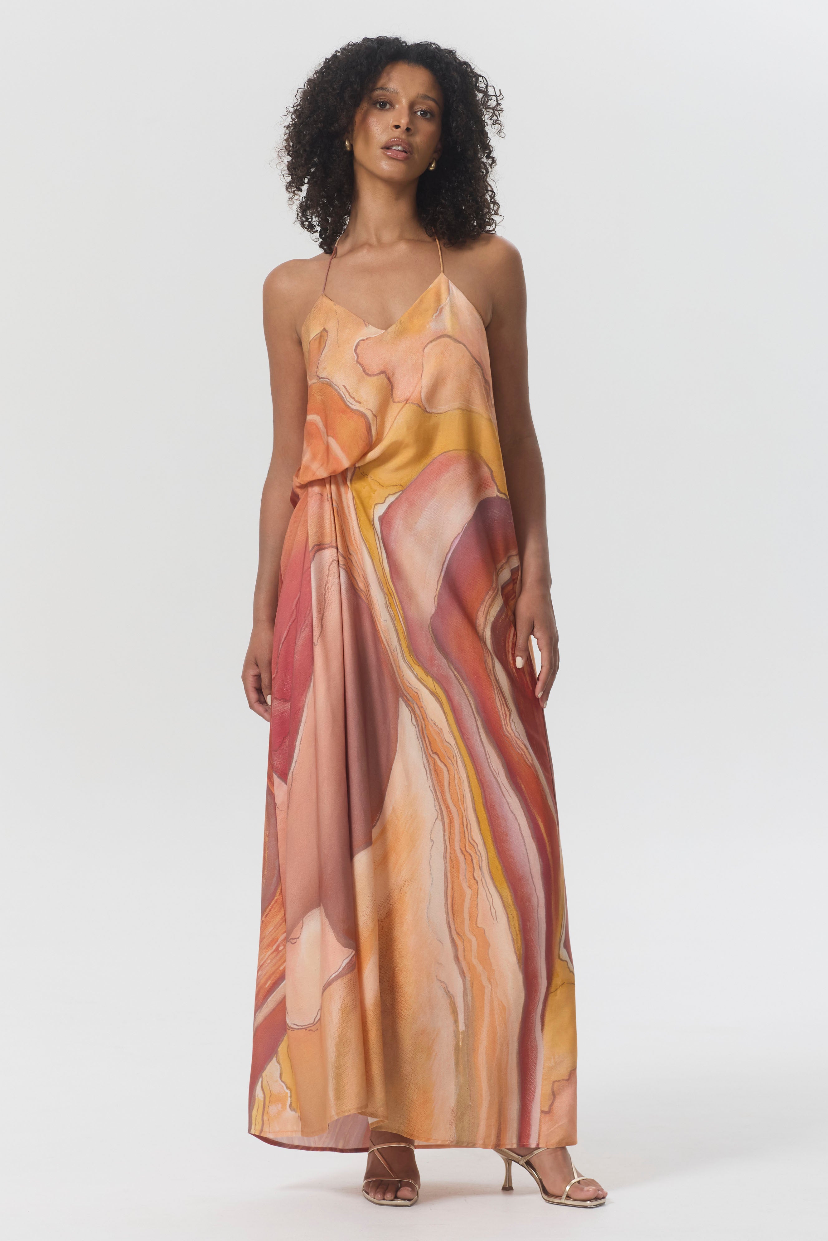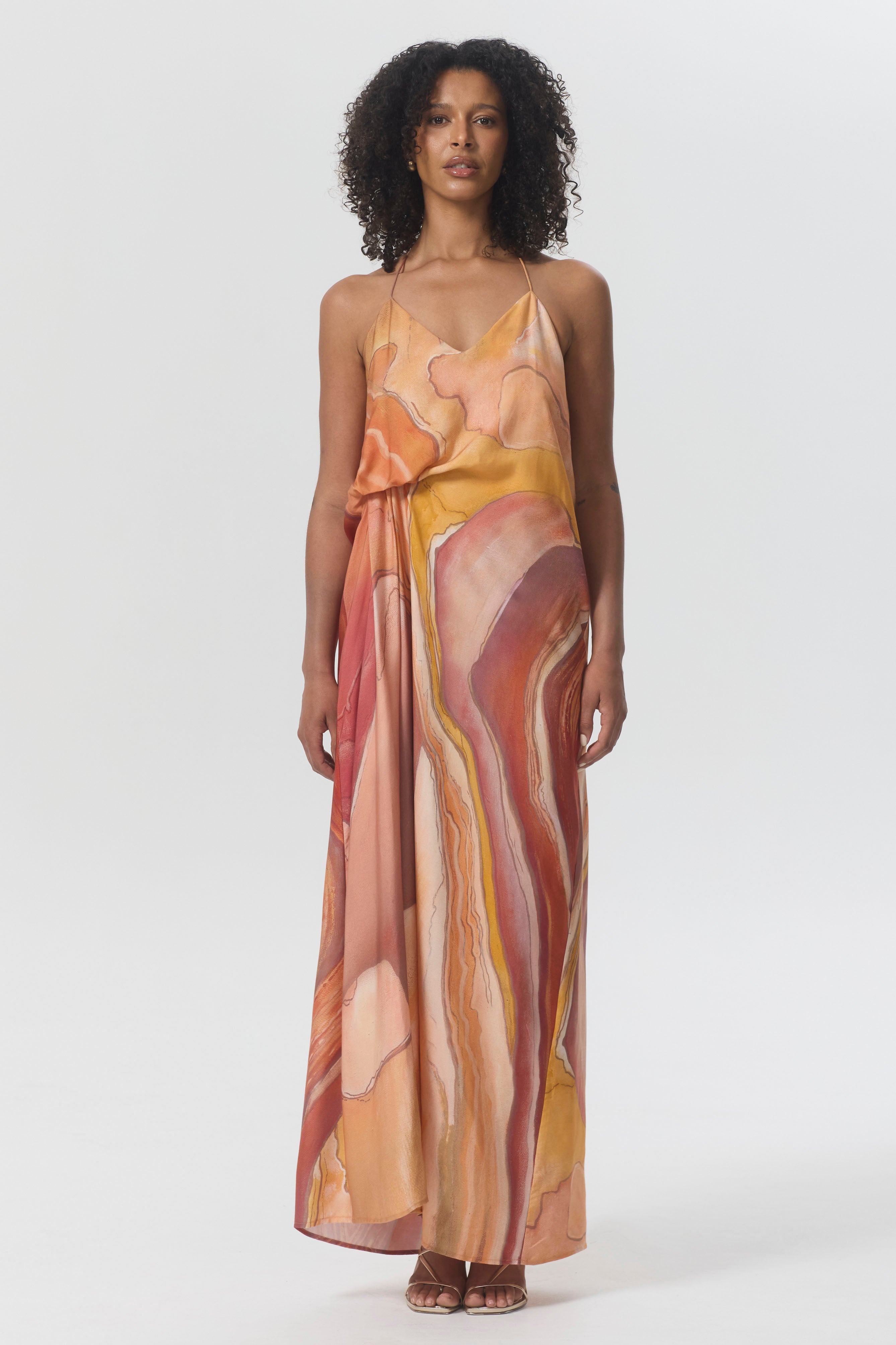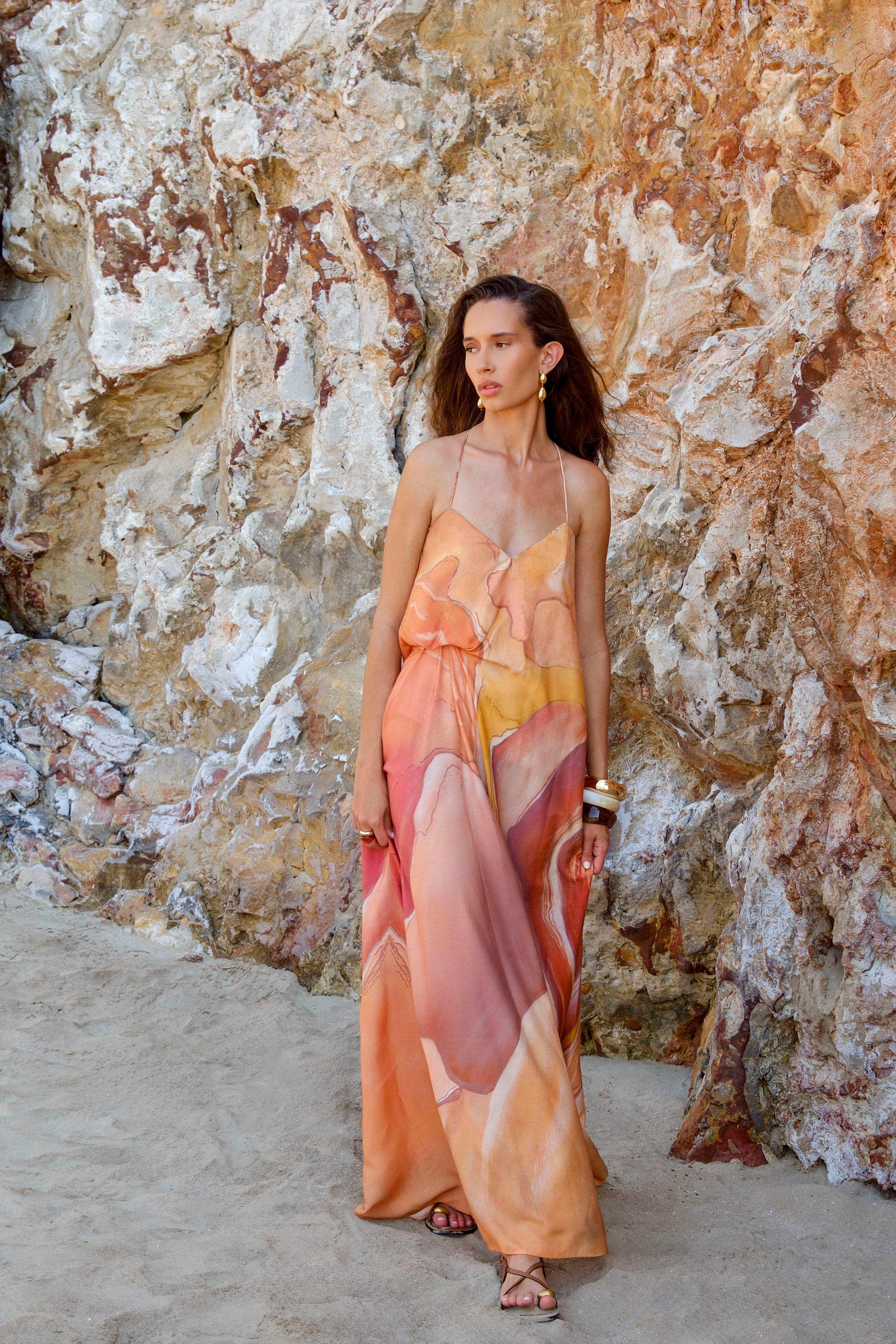 This striking maxi dress is designed to captivate, featuring our exclusive licensed print by artist Rebekah Treacy in a placement print that transforms the silhouette into a work of art.