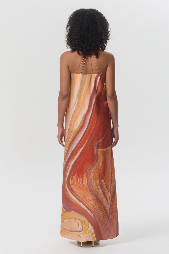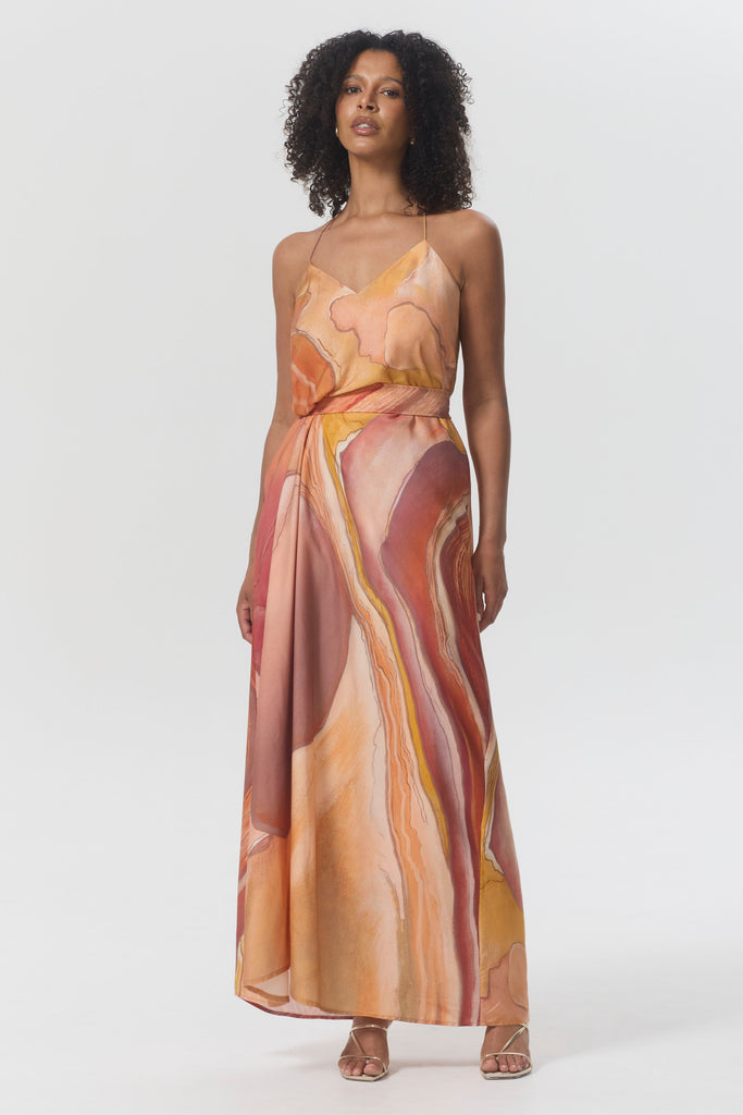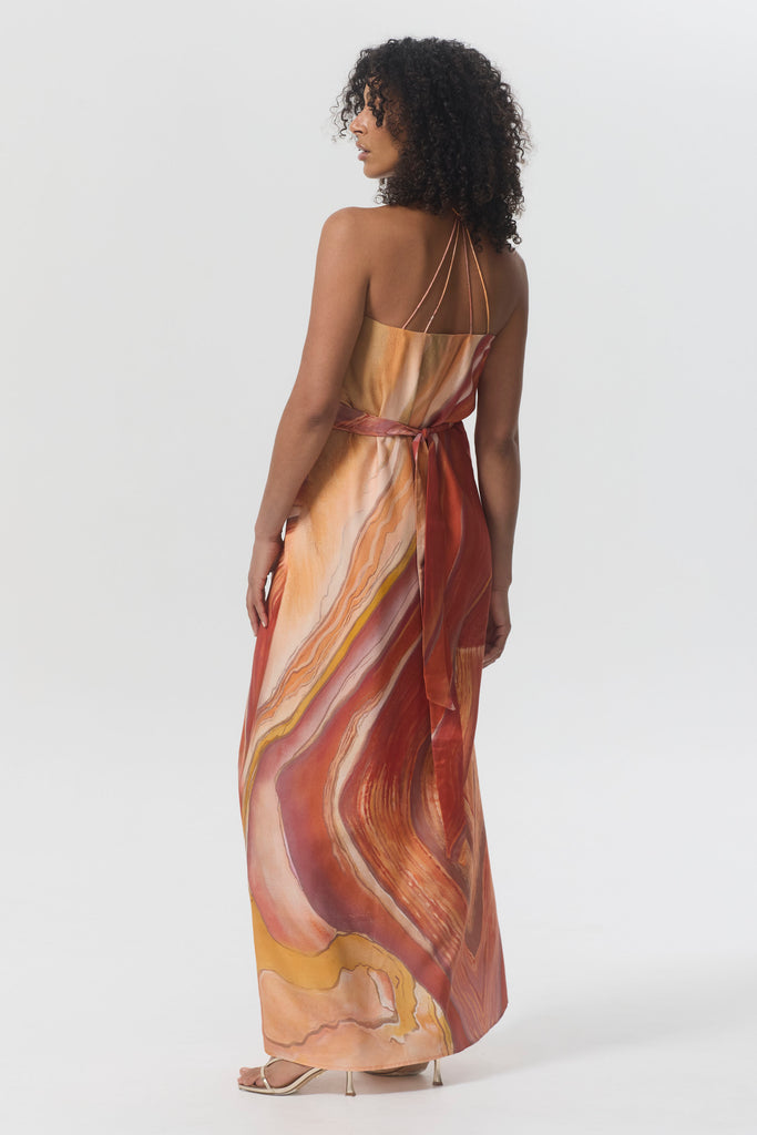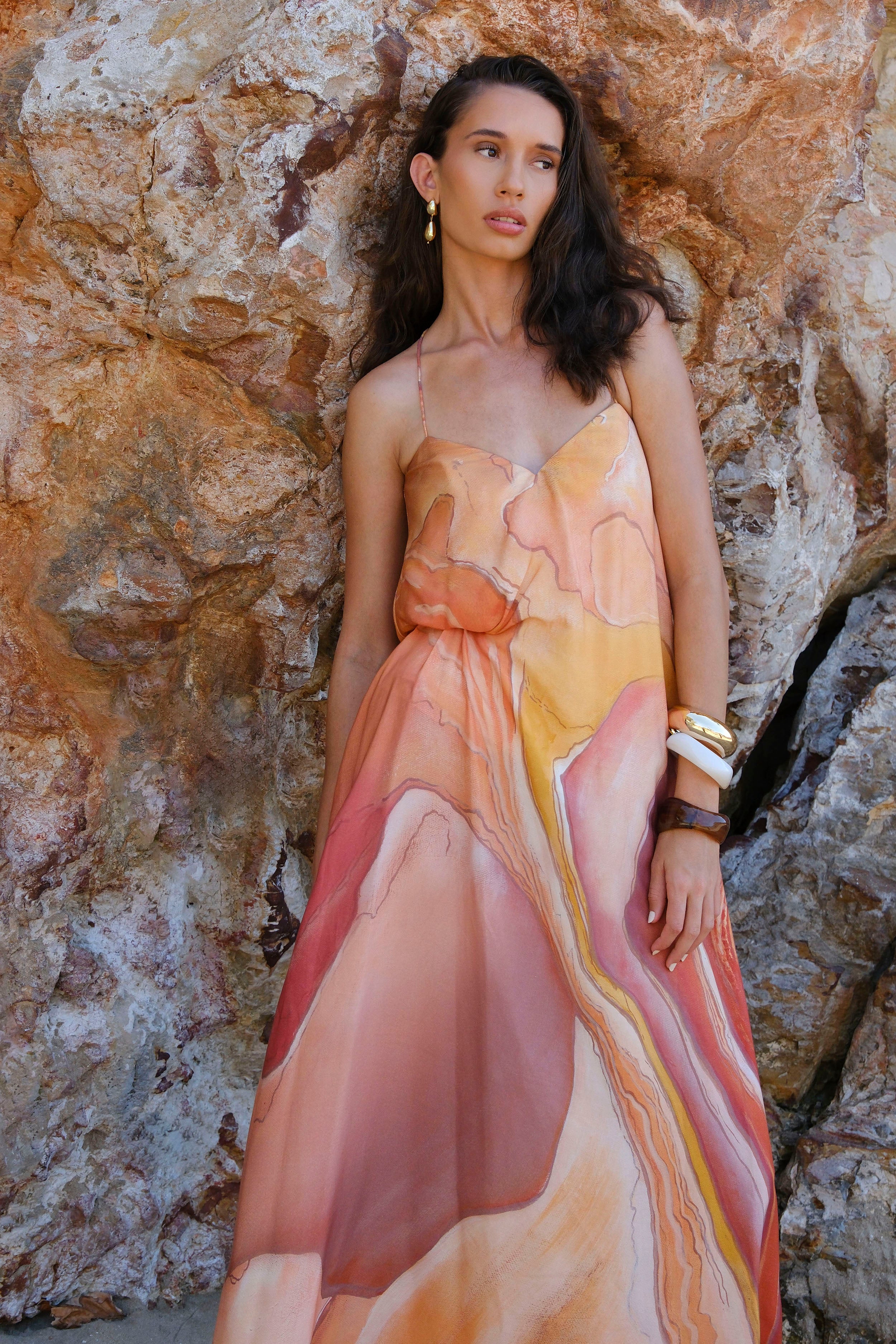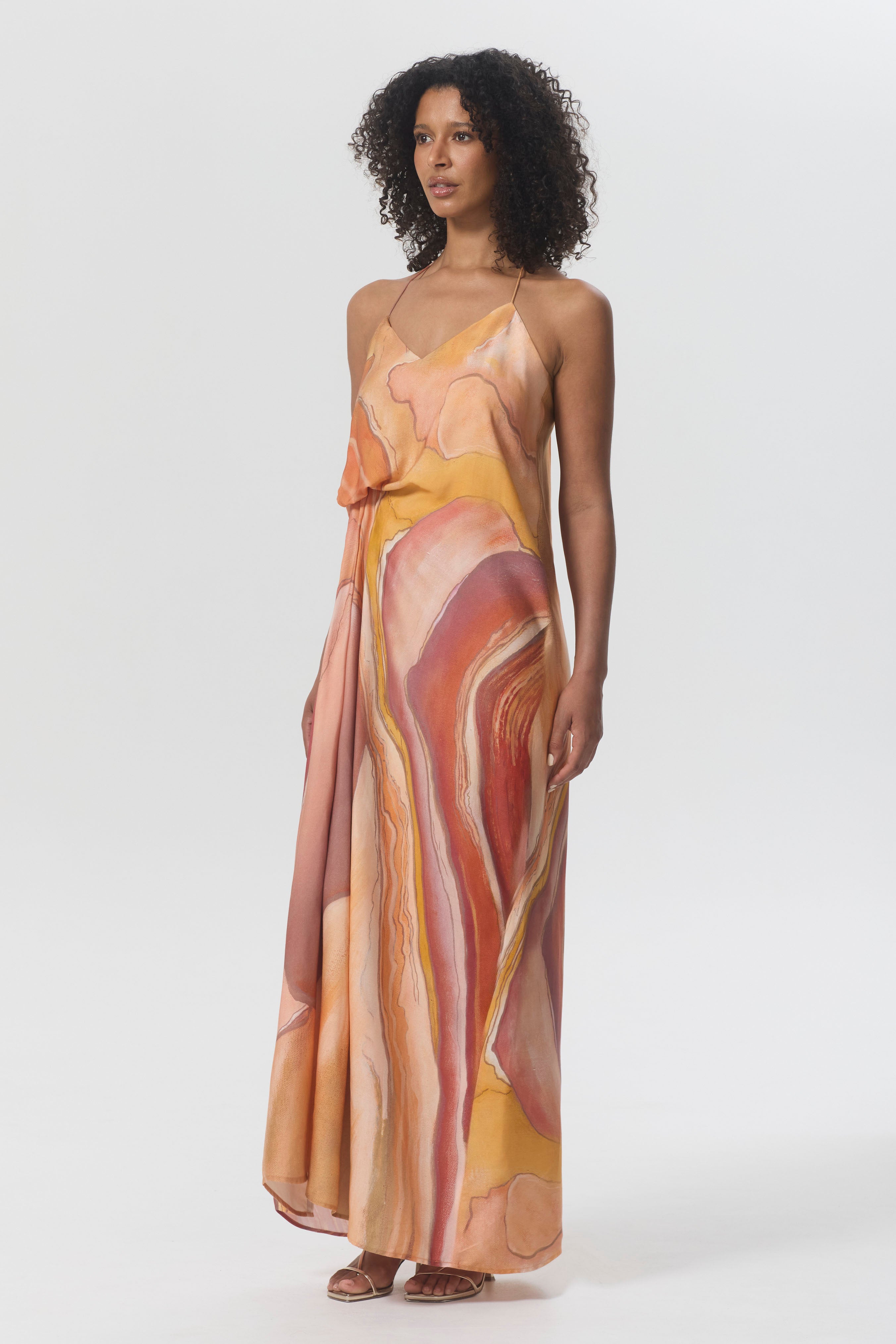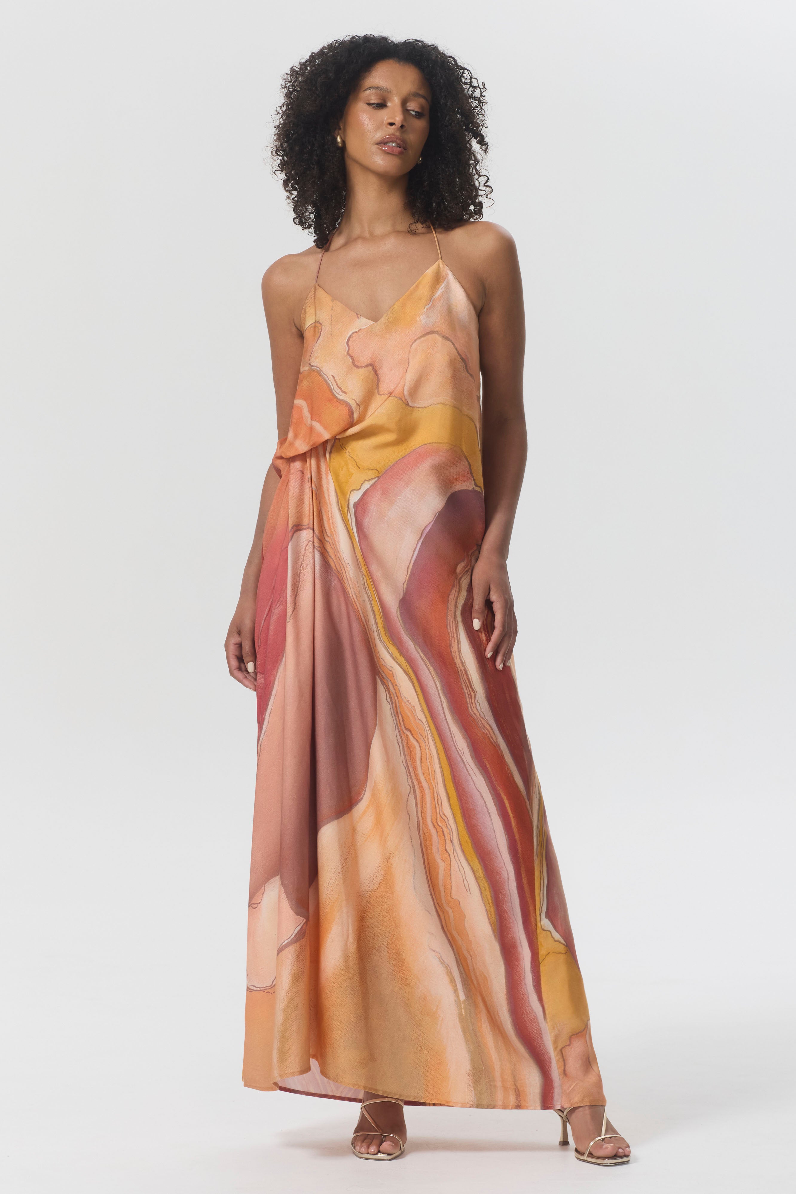 This striking maxi dress is designed to captivate, featuring our exclusive licensed print by artist Rebekah Treacy in a placement print that transforms the silhouette into a work of art.