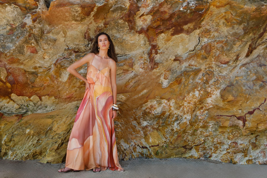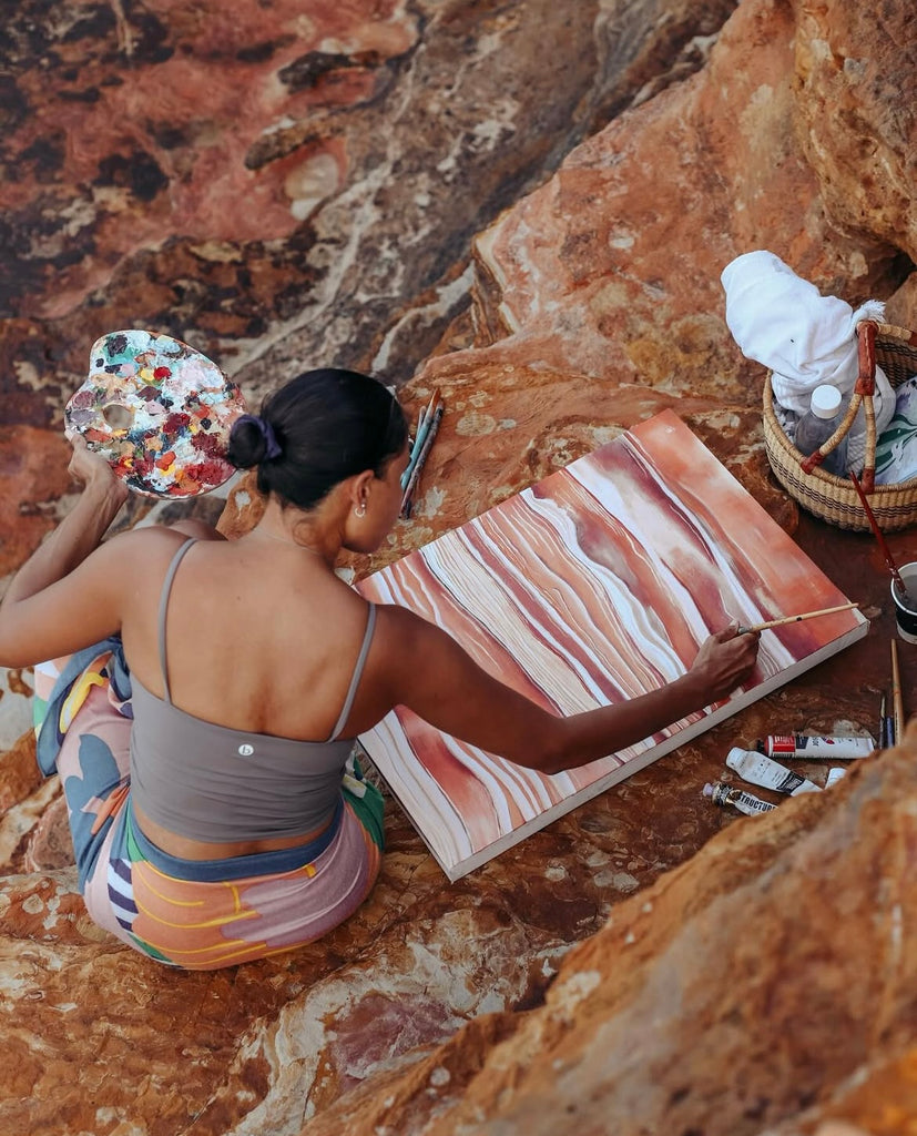 Rebekah Treacy is a formally trained visual artist, studying at the College of Fine Arts in Sydney. Her original artwork, ‘Layers of Reddell’ features in the Resort 2026 Collection, ‘TERRAIN’